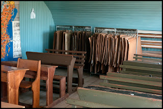 Skolbänkarna som är tidstypiska hittades på en loge en bit bort.
